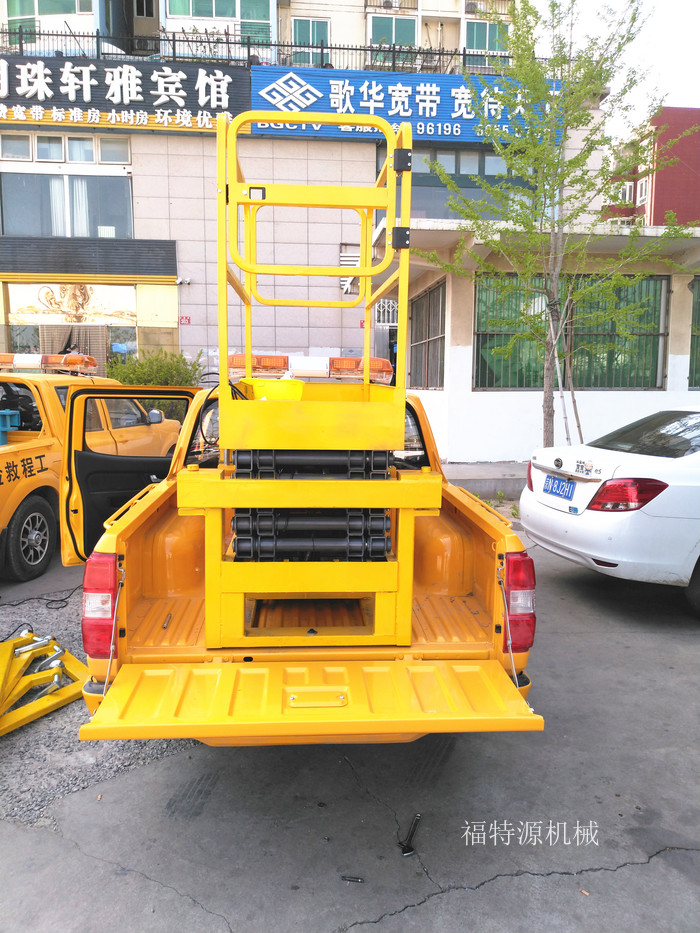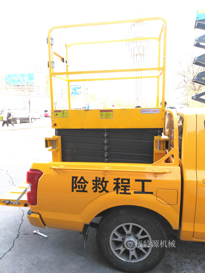 剪叉式升降機安裝于汽車車廂內、以汽車為行走底盤,汽車發動機為升降動力,無需外接電動力源,此類設備承載能力高、工作臺面積大可多人同時作業、移動靈活、鋼架結構強度高,升降平穩安全可靠、操作簡單、故障率低,可選擇自動伸縮式液壓支腿或可拆裝式手搖支腿。