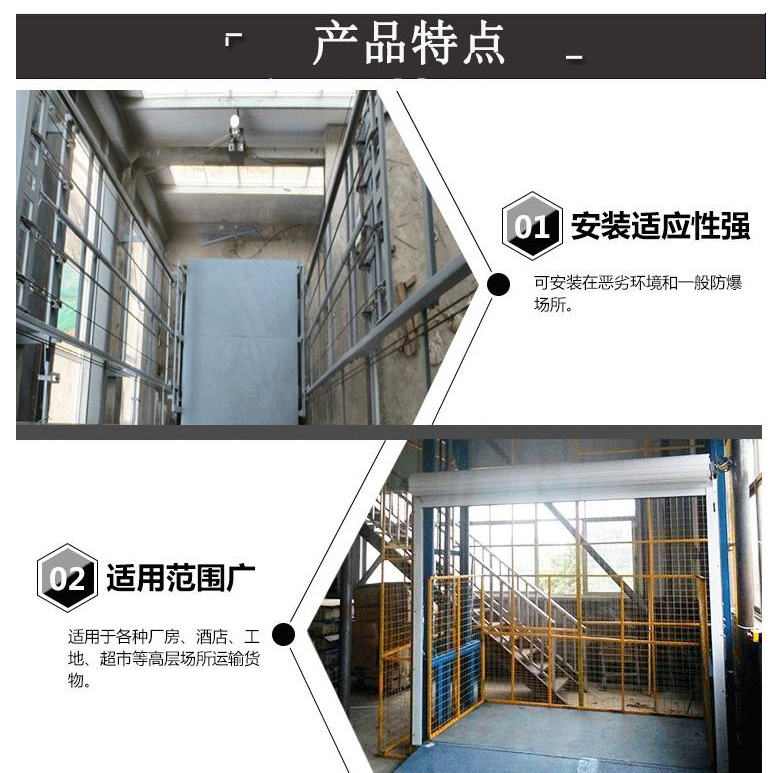 1、導(dǎo)軌式升降平臺(tái)負(fù)荷、載重通過(guò)油缸直接作用于基坑,井道強(qiáng)度要求低,磚結(jié)構(gòu)或磚混結(jié)構(gòu)井道即可;